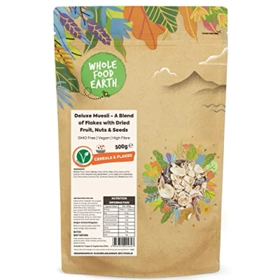✔ A WORLD OF GOODNESS: In a world full of fad diets, quick bites, and intricate recipes, don’t forget about the wonders of simple, nourishing food. We actively seek sustainable sources for our goods, asking our suppliers the tough questions that we know matter to our customers and making sure all our products are 100% GMO-Free. We follow strict hygiene processes to provide the best quality ingredients and have achieved a maximum of 5 Start food hygiene ratings. ✔ Deluxe Muesli - A Blend of Flakes with Dried Fruit, Nuts & Seeds: Our Deluxe Muesli is a perfectly made combination of Oatflakes, Fruits, and Nuts, including Almonds and Hazelnuts! It's also simple to add more ingredients to the muesli, enhancing the taste and nutrition while personalising it to your individual needs and dietary restrictions. What more could you want as the day begins? ✔ HIGH-QUALITY INGREDIENTS: It's also a good source of antioxidants, and protein, thanks to its high fruit and nut content. It undoubtedly improves and supports your digestive system because of its high fibre and whole grain content. The Muesli is also incredibly filling, so you get more bang for your buck, making it a useful tool for weight control, or more especially, hunger control. GMO-free Deluxe Muesli is suitable for Vegans. ✔ INSTRUCTION FOR USE: COLD WITH YOGURT. For a quick snack on the go, stir muesli in with your favourite yogurt. COLD WITH MILK. Pour milk over your muesli. HOT ON STOVETOP. Mix 1/3 cup muesli with 1/3 cup of water or milk and, stirring occasionally, bring to a boil, then remove from heat and let cool. ✔ JUST THE GOOD STUFF / FULLY RECYCLABLE PACKAGING: We believe that good food shouldn’t cost the earth, as such, sustainability matters to us dearly. That’s why we work tirelessly to find sustainable solutions throughout our business. We rolled out all-new 100% recyclable packaging on Wholefood Earth products. The new packaging is apt for kerbside recycling. ✔ OUR STORY: Thank you for knowing It's what's on the inside that counts. For wanting a future without toxins in the food your children eat. For protecting the biodiversity that nurtures animal habitats and makes crops thrive. From everyone here at Wholefood Earth, thank you for using your buying power to make meaningful, informed choices that will continue to nourish our people and our planet today, tomorrow, and forever. We're here for a healthier earth, sustainable earth, wholesome earth.