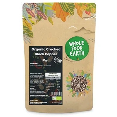 ✔ A WORLD OF GOODNESS: In a world of fad diets, quick bites, and intricate recipes, don’t forget about simple, nourishing organic wholefoods. Wholefood Earth is certified organic and has officially been awarded a 5-star Food Hygiene Rating ✔ Organic Cracked Black Pepper: Cracked pepper is made out of whole cracked black peppercorns. Peppercorns are the small fruits of a flowering vine native to India and Southeast Asia that thrives in tropical climates. Although cracked and ground black pepper are made from the same peppercorns, the cracked variant is substantially bigger and provides a pleasant crisp explosion of flavour with each bite. Cracked black pepper has a more robust flavour and texture than ground black pepper. ✔ HIGH-QUALITY INGREDIENTS: This "King of Spices" also has several health advantages. It can be used in curries, vegetable dishes, sauces, soups, stews, and many other foods. Black pepper improves metabolism and nutrient absorption. ✔ JUST THE GOOD STUFF / FULLY RECYCLABLE PACKAGING: We intend to get the purest gifts of Mother Nature from all over the world and offer to our customers the purest, organic, and healthy gifts of nature. Our products are gathered from the best origins. The new packaging is apt for kerbside recycling and resealable for Long Lasting Freshness. ✔ OUR STORY: We believe that Mother Nature knows best when it comes to quality, nutrition, and taste. We actively seek sustainable sources for our goods, asking our suppliers the tough questions that we know matter to our customers