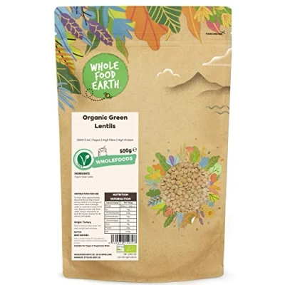 ✔ A WORLD OF GOODNESS: In a world of fad diets, quick bites, and intricate recipes, don’t forget about simple, nourishing organic wholefoods. Wholefood Earth is certified organic and has officially been awarded a 5-star Food Hygiene Rating ✔ NUTRITIOUS Organic Green Lentils: The lentil plant is one of our oldest food sources, having originated in Asia and North Africa. There are many different types, but the most used in cooking are brown, red, dark speckled, green, and yellow lentils. These "beans" are extracted from their shells and split in half along their natural seams, allowing for speedier cooking and removing the need for soaking. When cooked, split peas are high in protein, fibre and low in fat. ✔ HIGH-QUALITY INGREDIENTS: Vegetarians may obtain a lot of protein from lentils. Lentils are an essential element of vegan and vegetarian diets when protein intake must be controlled! Cooking is less essential than relaxing, and it's a good option for times when you need something quick, easy, delicious, and healthful. Whatever your lifestyle, these lentils offer the most nutrition, taste, and simplicity into a little but mighty package. ✔ INSTRUCTION FOR USE: Allow approximately 40g of lentils per 80g cooked serving. Wash in 3-4 changes of clean water. Soak in enough water to cover for at least 15-20 mins. Replace water with fresh water, bring to the boil for at least 10 minutes. Simmer for 30 mins or until tender. ✔ JUST THE GOOD STUFF / FULLY RECYCLABLE PACKAGING: We intend to get the purest gifts of Mother Nature from all over the world and offer to our customers the purest, organic, and healthy gifts of nature. Our products are gathered from the best origins ✔ OUR STORY: We believe that Mother Nature knows best when it comes to quality, nutrition, and taste. We actively seek sustainable sources for our goods, asking our suppliers the tough questions that we know matter to our customers.