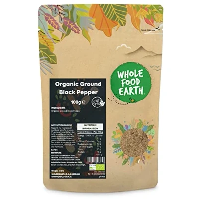 ✔ A WORLD OF GOODNESS: In a world of fad diets, quick bites, and intricate recipes, don’t forget about simple, nourishing organic wholefoods. Wholefood Earth is certified organic and has officially been awarded a 5-star Food Hygiene Rating ✔ Organic Ground Black Pepper: Black pepper powder is prepared by grinding dried black peppercorns. Peppercorns are the small fruits of a flowering vine native to India and Southeast Asia that thrives in tropical climates. So, what's the distinction between ground black pepper and the others? Although made from the same peppercorns, ground pepper has a milder flavour and does not have the same texture as whole or cracked pepper. ✔ HIGH-QUALITY INGREDIENTS: Black pepper has a strong, penetrating scent as well as a distinctive woody, piney flavour. It has a spicy and sour flavour. This "King of Spices" also has several health advantages. It can be used in curries, vegetable dishes, sauces, soups, stews, and many other foods. Black pepper improves metabolism and nutrient absorption. ✔ JUST THE GOOD STUFF / FULLY RECYCLABLE PACKAGING: We intend to get the purest gifts of Mother Nature from all over the world and offer to our customers the purest, organic, and healthy gifts of nature. Our products are gathered from the best origins. The new packaging is apt for kerbside recycling and resealable for Long Lasting Freshness. ✔ OUR STORY: We believe that Mother Nature knows best when it comes to quality, nutrition, and taste. We actively seek sustainable sources for our goods, asking our suppliers the tough questions that we know matter to our customers