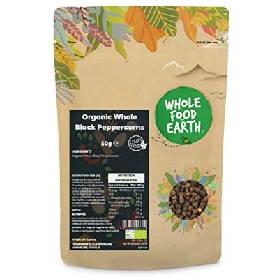✔ A WORLD OF GOODNESS: In a world of fad diets, quick bites, and intricate recipes, don’t forget about simple, nourishing organic wholefoods. Wholefood Earth is certified organic and has officially been awarded a 5-star Food Hygiene Rating ✔ Organic Whole Black Peppercorns: The dried black peppercorn berries are known as black pepper whole. Peppercorns are the small fruits of a flowering vine native to India and Southeast Asia that thrives in tropical climates. So, what's the difference between whole black pepper and ground black pepper? Although they all come from the same peppercorns, whole peppercorns have the freshest scent and the greatest spicy flavour. ✔ HIGH-QUALITY INGREDIENTS: Black pepper has a strong, penetrating scent as well as a distinctive woody, piney flavour. It has a spicy and sour flavour. This "King of Spices" also has several health advantages. It can be used in curries, vegetable dishes, sauces, soups, stews, and many other foods. Black pepper improves metabolism and nutrient absorption. ✔ JUST THE GOOD STUFF / FULLY RECYCLABLE PACKAGING: We intend to get the purest gifts of Mother Nature from all over the world and offer to our customers the purest, organic, and healthy gifts of nature. Our products are gathered from the best origins. The new packaging is apt for kerbside recycling and resealable for Long Lasting Freshness. ✔ OUR STORY: We believe that Mother Nature knows best when it comes to quality, nutrition, and taste. We actively seek sustainable sources for our goods, asking our suppliers the tough questions that we know matter to our customers