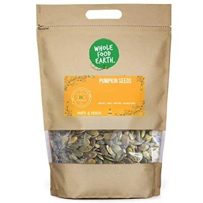 ✔ A WORLD OF GOODNESS: In a world full of fad diets, quick bites, and intricate recipes, don’t forget about the wonders of simple, nourishing food. We actively seek sustainable sources for our goods, asking our suppliers the tough questions that we know matter to our customers and making sure all our products are 100% GMO-Free. We follow strict hygiene processes to provide the best quality ingredients and have achieved a maximum of 5 Start food hygiene ratings. ✔ Pumpkin Seeds: The popularity of pumpkin seeds extended from America to the rest of the world through commerce and travel. Pumpkin seeds have become a staple of everyday food in portions of Eastern Europe and the Mediterranean (particularly Greece). Culinary and medicinal traditions in India and other regions of Asia also included this cuisine, recognising and appreciating the role of seeds in the diet. ✔ HIGH-QUALITY INGREDIENTS: Pumpkin seeds include proteins and fibre and many other nutrients. The seeds themselves are delicious and can be used in a variety of ways; one of my favourites is a pumpkin and sunflower seed salad for hot summer nights! Pumpkin seeds are non-GMO, natural, and suitable for vegans. ✔ INSTRUCTION FOR USE: Perfect for Snacking & Toasting. Adding to salads. Making seed butter. Adding to bread & bakes. Make granola or flapjacks. Make your own trail mix by combining it with dried cranberries & whole almonds. ✔ JUST THE GOOD STUFF / FULLY RECYCLABLE PACKAGING: We believe that good food shouldn’t cost the earth, as such, sustainability matters to us dearly. That’s why we work tirelessly to find sustainable solutions throughout our business. We rolled out all-new 100% recyclable packaging on Wholefood Earth products. The new packaging is apt for kerbside recycling. ✔ OUR STORY: Thank you for knowing It's what's on the inside that counts. For wanting a future without toxins in the food your children eat. For insisting on the accountability that traces food back to its source. For protecting the biodiversity that nurtures animal habitats and makes crops thrive. And, from everyone here at Wholefood Earth, thank you for using your buying power to make meaningful, informed choices that will continue to nourish our people and our planet today, tomorrow, and forever. We're here for a healthier, sustainable, and wholesome earth.