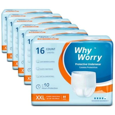 MAXIMUM ABSORBENCY: WhyWorry disposable incontinence pant features a super absorbent core which turns liquid into gel in seconds, offering up to 10 hours of dryness and overnight protection. Each pull up for bladder leaks is also made with an improved liner that wicks wetness away from your skin to help keep dry. LEAK BARRIER GUARDS: Our protective underwear for men and women is equiped with reinforced leak barrier guards, which is designed to prevent leakage while providing superior protection and security, helping you stay dry and confident in any situation. ODOR CONTROL: With the help of our advanced odor control technology, Why Worry heavy absorbency adult pull ups instantly neutralize odors, keeping our users free from unpleasant smells and guaranteeing a more hygienic and comfortable environment for them. SOFT & COMFORTABLE: WhyWorry incontinence pants with elastic waistband, are crafted from extra-soft, breathable, latex-free materials. It adapts seamlessly to a variety of body shapes and sizes, effectively reducing friction and skin irritation. Tear-away sides allow for easy removal and the colored stitching indicates the back side. IDEAL FOR MULTIPLE SCENARIOS: Perfect for men, women, teens, seniors individuals recovering from surgery, and anyone dealing with urine incontinence. Additionally, they are also ideal for women during pregnancy and postpartum. These Why Worry incontinence pants are designed to meet diverse needs with ultimate comfort.