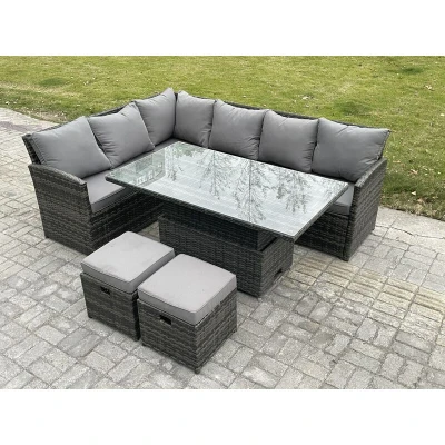 Wicker pe Outdoor Rattan Garden Furniture Set Height Adjustable Rising Lifting Table Sofa Dining with 2 Small Footstools Dark Grey Mixed Fimous