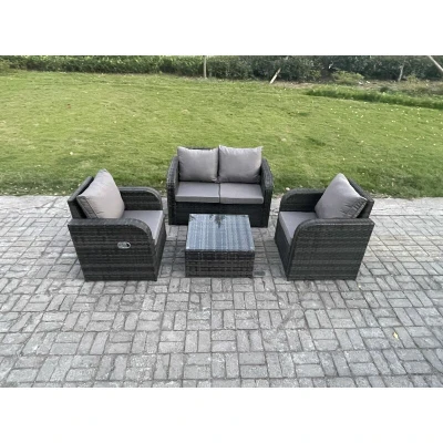 General description This PE rattan outdoor furniture set is a stylish and functional addition to your patio or garden. Made from high-quality PE rattan and durable galvanized steel construction, it offers sturdiness and long-lasting use. This garden furniture set is designed for outdoor use all year round. Technical specifications 2 x Reclining Chairs: 74L x 67W x 79H cm 1 x Love Sofa: 124W x 67D x 79H cm 1 x Square Coffee Table: 65L x 65W x 34H cm Seat Cushion Thickness: 8 cm Material: Dark grey mixed rattan with dark grey fabric Glass Tabletop: 5mm thickness transparent tempered glass Installation Items come flat packed and are easy to assemble. Sturdy galvanized steel tube metal frames with powder coating to prevent rust. Usage The armchairs are adjustable, allowing you to change the backrest inclination from 90° to 130°. Removable cushion covers for easy maintenance. Keep cushions indoors or use a rain cover when not in use. Use a rain cover if the furniture is not used for an