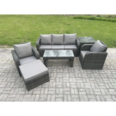 General description This PE rattan outdoor furniture set is an excellent addition to your patio or garden. It is made of high-quality PE rattan and features a durable galvanized steel construction, ensuring sturdiness and longevity. This garden furniture set is designed for outdoor use all year round. Technical specifications Set Dimensions: 1 x Side coffee table: 65L x 65W x 66H cm 1 x Big footstool: 65L x 65W x 34H cm 2 x Reclining Chairs: 74L x 67W x 79H cm 1 x 3-seater Sofa: 177W x 67D x 79H cm 1 x Oblong Coffee table: 105L x 50W x 48H cm Color: Dark grey mixed rattan with dark grey fabric Seat Cushion Thickness: 8 cm Installation Items come flat packed and are easy to assemble. Includes sturdy galvanized steel tube metal frames with powder coating to prevent rust. Usage The two armchairs are adjustable, allowing you to change the inclination of the chair back from 90° to 130°. Keep the cushions indoors or use a rain cover when not in use. It is recommended to cover the furniture