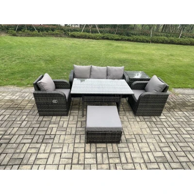 General description This deluxe 6-piece reclining rattan sofa set is an excellent addition to your patio or garden. Made from high-quality PE rattan and durable galvanized steel construction, it offers sturdiness and longevity, making it suitable for outdoor use all year round. This set is perfect for gathering with family and friends. Technical specifications Set Dimensions: 1 x Side coffee table: 65L x 65W x 66H cm 1 x Big footstool: 65L x 65W x 34H cm 2 x Reclining Chairs: 74L x 67W x 79H cm 1 x 3-seater Sofa: 177W x 67D x 79H cm 1 x Dining Table: 140L x 80W x 69H cm Color: Dark grey mixed rattan with dark grey fabric Seat Cushion Thickness: 8 cm Armrest Width: 9 cm Glass Thickness: 5 mm clear tempered glass Installation Items come flat packed and are easy to assemble. Usage The two armchairs are adjustable, allowing you to change the backrest inclination from 90° to 130°. For maintenance, keep the cushions indoors or use a rain cover when not in use. It is recommended to cover the