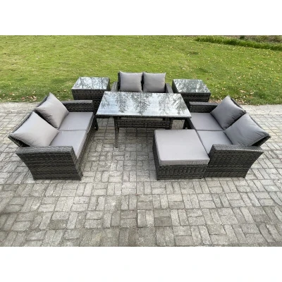 Wicker pe Rattan Garden Furniture Sets Outdoor Lounge Sofa Set with Oblong Dining Table Double Seat 2 Side Tables Big Footstool Dark Grey Mixed