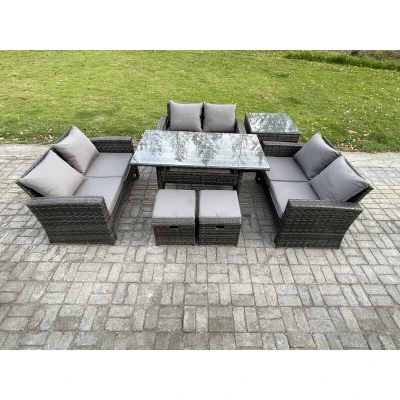 Wicker pe Rattan Garden Furniture Sets Outdoor Lounge Sofa Set with Oblong Dining Table Double Seat Side 2 Small Footstools Dark Grey
