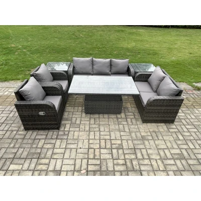 Wicker pe Rattan Outdoor Garden Furniture Sets Height Adjustable Rising lifting Dining Table Reclining Chair Sofa Set with 2 Side Tables Dark Grey