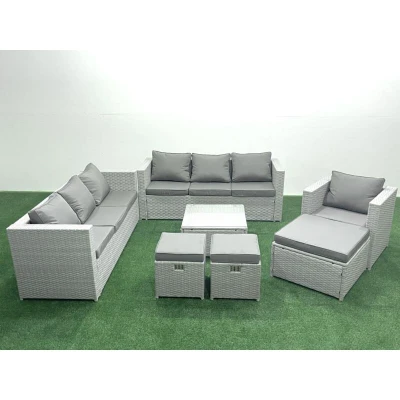 General description This deluxe rattan sofa set is a great addition to your patio or garden, made of high-quality PE rattan and durable galvanized steel construction for sturdiness and long-lasting durability. It can be placed outdoors all year round, featuring a stylish light grey mixed rattan and dark grey fabric design. The set includes two sofas, an armchair, a square coffee table, and three footstools, providing ample seating and comfort for outdoor relaxation. Technical specifications 2 x Sofa with double armrest: 177W x 65D x 66H cm 1 x Armchair: 74L x 65W x 66H cm 1 x Big footstool: 65L x 65W x 34H cm 2 x Fully assembled stools: 40W x 40D x 34H cm 1 x Square coffee table: 65L x 65W x 34H cm 5mm thickness clear tempered glass with sucker on the surface 8cm thick seat cushions Installation Items come flat-packed, requiring self-assembly. Usage Removable cushion covers for easy cleaning. Recommended to keep cushions indoors or use a rain cover when not in use. Covering the