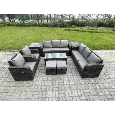 General description This deluxe Garden furniture set enhances the decor of your patio, deck, backyard, porch, and pool area. It features a versatile design that allows for easy configuration into different arrangements based on your needs. The set includes two small footstools that can be conveniently stored under the table when not in use, keeping your space tidy. Technical specifications Set Dimensions: 2 x Side coffee table: 65L x 65W x 66H cm 2 x Fully assembled small footstools: 40L x 40W x 34H cm 2 x Reclining chairs: 74L x 67W x 79H cm 2 x 3-seater sofas: 177W x 67D x 79H cm 1 x Oblong coffee table: 105L x 50W x 48H cm Material: Dark grey mixed rattan with dark grey fabric Seat cushion thickness: 8 cm Frame: Sturdy galvanized steel tube with powder coating to prevent rust Glass: 5mm thickness transparent tempered glass with suckers on the surface to prevent sliding Installation Items come flat packed and are easy to assemble. Usage Keep the furniture covered with a rain cover