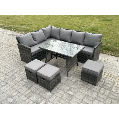 Wicker Rattan Garden Furniture Corner Sofa Set with Oblong Dining Table 3 Small Footstools 9 Seater Outdoor Dark Grey Mixed Fimous