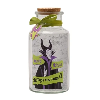 A Maleficent light up jar by DISNEY This stanThe clear glass jar showcases a printed image of Maleficent, complete with ‘Not That Impressed’ title, internal paper background design, green ribbon bow around the neck and cork closing lid. dout jar is wickedly colourful and shines a light upon vivid villains. Product Dimensions: H 170, W 81, D 81mm, Manufacturer: Widdop