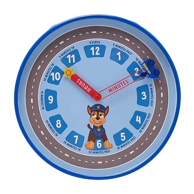 Transform a child's space with the Paw Patrol Chase Wall Clock. The clock face is a dynamic scene, with a grey road circling around it, creating a playful environment where the blue car travels on its mission. The clock is numbered 1-12, and minutes past and to the hour are clearly worded, making it an excellent educational tool for young learners. Embrace the joy of Paw Patrol with this whimsical and vibrant timekeeping accessory., Manufacturer: Widdop & Co.