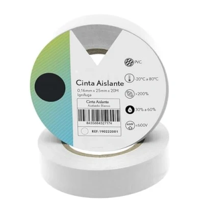 Wide insulation tape made of white PVC, measuring 25 mm x 20 m. This product is characterised by its flexibility that allows it to adapt to different shapes and surfaces during electrical work White PVC insulation tape 25mm wide and 20m long ideal for electricians It is characterized by its flexibility, which allows easy handling in various electrical applications and ensures safe and well-insulated connections. Its durability guarantees reliable performance in any environment and makes it the perfect tool for professional and domestic work. Wide White PVC Insulation Tape 25mm x 20m Ideal for Electricians This product is flexible and adapts to different applications to ensure safe and reliable electrical installation. The durable design provides excellent wear resistance, making it an indispensable tool in any electrical job. The wide 25mm x 20m white PVC insulation tape is ideal for electricians Its flexibility allows for easy handling in various applications, while its durability ensures long performance in electrical work and effectively protects connections and components. Perfect for those looking for safety and efficiency in their projects. White PVC Insulation Tape 25mm x 20m Ideal for Electricians Its high flexibility allows for easy application on different surfaces and ensures effective and durable insulation. Perfect for bundling, covering and protecting electrical cables, this tape is a must have in any toolbox. The wear resistance and moisture resistance make it a reliable choice for indoor and outdoor electrical projects.