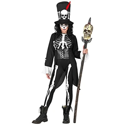 Are you looking for a Halloween costume? Then this Voodoo priestess costume from Widmann is just the thing for you Included is a black tailcoat with an equally black corset, a belt, a pair of white arm warmers, a jumpsuit, a briefs and a hat. The jumpsuit is printed with white skeleton bones and fits close to the skin. The hat is printed with white bones and decorated with a red feather The costume set comes in size S. With the right accessories, for example a Voodoo stick (not included), it can be perfectly completed This sexy outfit will make you an eye-catcher at the next Halloween party More beautiful costumes and accessories can be found in our brand shop. Click on the brand name Widmann below the product title, Manufacturer: Widmann