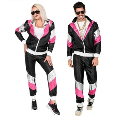 For carnival and parties: this 80s retro tracksuit costume is the optimal fancy dress for fancy dress, theme parties or festivals and provides a casual, eye-catching look Complete set with luminous effect: the jogging suit, consisting of jacket with zip and trousers with elastic, not only impresses with its retro design, but also lights up under UV light for an impressive appearance STYLISH DESIGN The elegant black combined with metallized stripes gives this costume an authentic 80s charm with modern shiny accent Size M: the costume is suitable for men and women alike, and has been designed so that you can wear it comfortably over normal clothing Optimal for groups: choose from different colors, patterns and sizes to shine with your family or friends in 80s style, Manufacturer: Widmann S.r.l.