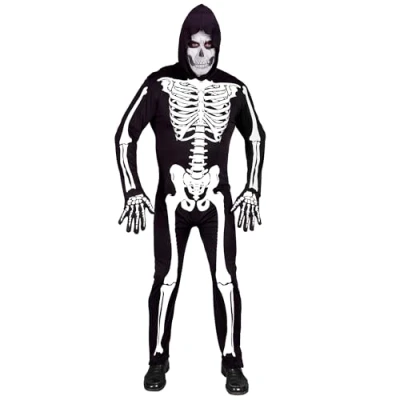 With this luminous skeleton costume, you will be the centre of attention at any party The costume for adults is available in size S Im Lieferumfang enthalten ist ein schwarzer Overall mit Kapuze fr einen gruseligen Look von Kopf bis Fu The jumpsuit is printed with a white skeleton which glows under UV light Komplementieren knnen Sie den Look mit einem penden Make Up oder einer gruseligen Maske (nicht enthalten), Manufacturer: Widmann