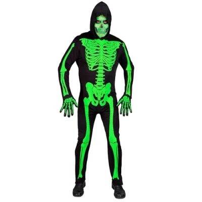 With this luminous skeleton costume, you will be the centre of attention at any party The costume for adults is available in size M Im Lieferumfang enthalten ist ein schwarzer Overall mit Kapuze fr einen gruseligen Look von Kopf bis Fu The jumpsuit is printed with a neon green skeleton that lights under UV light Komplementieren knnen Sie den Look mit einem penden Make Up oder einer gruseligen Maske (nicht enthalten), Manufacturer: Widmann