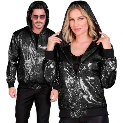 This sequin bomber jacket with hood is a real eye-catcher that attracts attention The jacket is available in size S/M for adults Sie ist mit zahlreichen schwarzen Pailletten besetzt und ist fr Damen sowie Herren gleichermaßen maen geeignet Wenn das Licht auf der Tanzflche auf Sie fllt, werden die Pailletten das Licht reflektieren und fr ein atemberaubende Funkeln sorgen Diese Jacke ist ideal fr Clubabende, Partys, Festivals und andere Veranstaltungen, bei denen Sie sich von der Me abheben mchten mchten, Manufacturer: Widmann S.r.l.