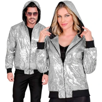 This sequin bomber jacket with hood is a real eye-catcher that attracts attention The jacket is available in size S/M for adults Sie ist mit zahlreichen silberfarbenen Pailletten besetzt und ist fr Damen sowie Herren gleichermaßen maen geeignet Wenn das Licht auf der Tanzflche auf Sie fllt, werden die Pailletten das Licht reflektieren und fr ein atemberaubende Funkeln sorgen Diese Jacke ist ideal fr Clubabende, Partys, Festivals und andere Veranstaltungen, bei denen Sie sich von der Me abheben mchten mchten, Manufacturer: Widmann