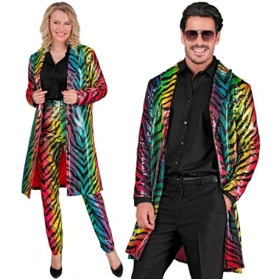 This sequin coat in rainbow colours is a real eye-catcher that attracts attention It is available in size L/XL for adults It is designed with a tiger pattern and suitable for men and women alike When the light falls on you on the dance floor, the sequins will reflect the light and provide a stunning sparkle This coat is ideal for club nights, parties, festivals, carnival and other events where you want to stand out from the crowd, Manufacturer: Widmann