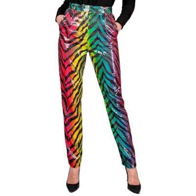 Mit dieser bunten Hose der Firma Widmann sind Sie bereit, um auf der nchsten Karnevalsparty aufzufallen It is available in the size S for adults Sie verfgt ber zwei Hosentaschen und bietet auerdem die Mglichkeit, einen Grtel anzubringen The entire trousers are decorated with sparkling sequins, in rainbow colours with tiger pattern The combination possibilities are endless, wear the women's trousers with a matching blouse or put on trendy gles (no accessories included) to complement the look, Manufacturer: Widmann S.r.l.