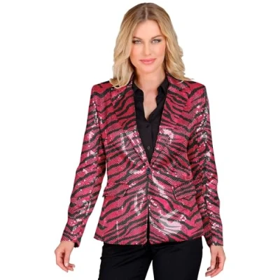 With this pink blazer from Widmann, you are ready to stand out at the next carnival party It is available for adults in size XXL The blazer is designed with a zebra pattern and fully studded with sparkling sequins Furthermore, it is equipped with two pocket patches and a button on the front Whether at the hit move, carnival or a safari themed party, with this blazer you will be the centre of attention at any event, Manufacturer: Widmann