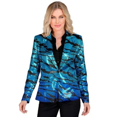 With this blue blazer from Widmann, you are ready to stand out at the next carnival party It is available for adults in size S The blue blazer with black stripes is fully trimmed with sparkling sequins Furthermore, it is equipped with two pocket patches and a button on the front Whether at the hit move or the next carnival party, with this blazer you will be the centre of attention at any event, Manufacturer: Widmann