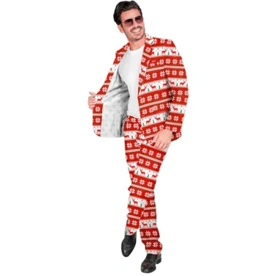 Spread Christmas cheer with this elegant red men's suit from the company Widmann Included are both the jacket and the trousers in size S The suit is decorated with reindeer, snowflakes and Christmas trees A special highlight is that the suit glows under UV light Whether Christmas party, carnival, Christmas gift or other festive occasions, with this men's suit you will be the centre of attention and attract everyone's attention, Manufacturer: Widmann
