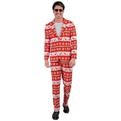 Spread Christmas cheer with this elegant red men's suit from the company Widmann Included are both the jacket and the trousers in size XL The suit is decorated with reindeer, snowflakes and Christmas trees A special highlight is that the suit glows under UV light Whether Christmas party, carnival, Christmas gift or other festive occasions, with this men's suit you will be the centre of attention and attract everyone's attention, Manufacturer: Widmann