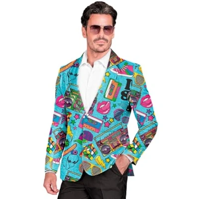 With this party fashion jacket from Widmann, you can stylishly revive the 80s Erhltlich ist es in der Gre M The suit jacket is in a light blue colour and decorated with 80s motifs such as cettes, ghetto ers, magic cubes and numerous other matching designs Ein besonderes Highlight ist, d alle Motive unter UV-Licht leuchten und Ihre Prsenz somit auf jeder Party unbersehbar wird Awaken your inner gentleman and be ready to be in the spotlight, be it at the hit move, a carnival party or a New Year's Eve themed party, Manufacturer: Widmann