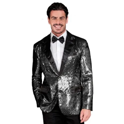 With this jacket, you are ready to stand out at the next carnival party The jacket is available in size S for adults The jacket is fully decorated with black sparkling sequins Furthermore, it has a satin collar as well as two satin pocket patches and a button on the front Whether at the hit move, carnival or Christopher Street Day, with this blazer you will be the centre of attention at any event, Manufacturer: Widmann S.r.l.