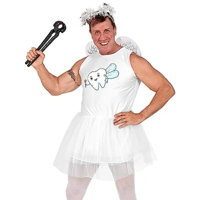 Tooth fairy outfit: a unique set that includes a tutu dress with fun print on the front, transparent wings with embroidery, headpiece with headband Fun and quirky design: perfect for those who want to stand out with a cheerful and unconventional look Metallic effect details, to make your outfit more shiny Ideal for various occasions: drag queens, fairy tales, graduation parties, funny events, Carnival and themed parties Size: M/L. Item code: 48633, Manufacturer: Widmann
