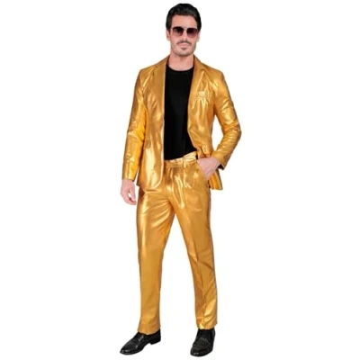 Dieser Anzug der Firma Widmann berzeugt durch seine auffllige glnzende Farbe The costume for adults is available in size XL Included are both the jacket and the trousers in an elegant gold Die Anzugjacke ist mit zwei Knpfen auf der Vorderseite ausgestattet, wodurch die Option besteht, diese entweder offen oder geschlossen zu tragen Bring your inner gentleman to life and be ready to turn heads, Manufacturer: Widmann