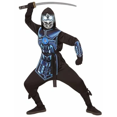 Children's Ninja costume Cyber, 5 piece set for boys Size: 164 cm (suitable for 14 ~ 16 year old) Inhalt: Hooded Tops, armour, belt, arm guards, mask with glowing eyes and 3 robot voices Colour: Black/Blue For Carnival, theme nights or other fancy dress events, Manufacturer: Widmann S.r.l.
