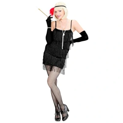 With this costume from Widmann, you can transform yourself into a seductive dancer from the 20s The costume for adults is available in size S Included are the black dress and headband with red feathers The dress is decorated on the front with fringes that will swing along when dancing With matching accessories such as a cigarette holder or a pearl necklace (not included), you can perfectly complement the 20s outfit, Manufacturer: Widmann