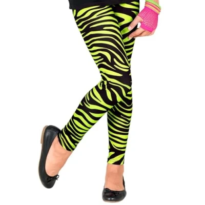 WIDMANN Girls 29388 Leggings for Children, Tiger, Neon Green, 80s, Animal Print, Disco Fever, Bad Button, Striped Pattern, Theme Party, Carnival, Multicoloured, 158