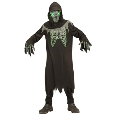 Kids Grim Reaper Costume Knee Length Pull-on Onesie Size: 128 cm Contents: Robe, gloves, mask with hood and luminous eyes Colour: black For Halloween, carnival or other costume parties, Manufacturer: Widmann