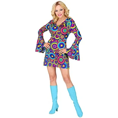 Transform yourself into a 70s dancing queen with this fancy dress costume! Adult costume is available in size XS The delivery includes a colourful short dress with trumpet sleeves With matching accessories such as wig, flower crown or glasses (not included), you can perfectly complete the costume Ideal for carnival, theme parties or punching show, Manufacturer: W WIDMANN MILANO Party Fashion