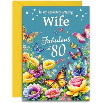 WIFE 80TH BIRTHDAY CARD ⭐ Pretty Butterflies and Flowers Design ⭐ Click the second image for the text inside the card. EXTRA THICK CARDSTOCK ⭐ 330gsm triple coated cardstock with a lovely matt inside surface for ease of writing SIZE ⭐This birthday card measure 148 x 210mm (A5 Size) and comes with a 162 x 229mm yellow envelope UK MANUFACTURED ⭐ A small family business. Professionally printed in our Hampshire factory ECO FRIENDLY ⭐ Our factory runs on 100% renewable energy. Our cardstock is sustainably sourced. Both the card and envelope are fully recyclable.
