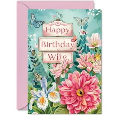 Dazzle your Wife with joy using our exquisite Happy Birthday Card Wife; a premium quality masterpiece that features a captivating design of a nature garden saying 'Happy Birthday Wife'. The beautiful colours on this card make it shine, ensuring it's not just a card but a beautiful keepsake. It's a Personal Gift to express your love and appreciation on her special day. What's Inside: Delve into a world of elegance with the inside print showcasing a lovely verse, 'Wishing you a beautiful day' as seen in the second image. There's ample space for your personal message. Crafted on a 360-micron thick environmentally responsible board, this one-sided gloss board offers a luxurious look and feel. Paired with a colored gummed envelope that complements the design, making it a truly special birthday gesture. Ink Perfection: Say goodbye to ink smudges! Our high-quality one-sided coated board ensures a smooth writing experience without the worry of smudging. The uncoated side absorbs ink, providing a flawless finish that adds to the card's overall premium quality. Wife birthday cards, ladies birthday card, womens birthday card, Female birthday cards. Dimensions that Impress: Greet with grandeur using a card sized at 148mm x 210mm, accompanied by an envelope measuring 150mm x 212mm. The card boasts a thickness of 360 microns, ensuring a substantial and impressive presence. Wife birthday card, happy birthday Wife card, birthday card Female, rose birthday cards for women, birthday card flowers. British Craftsmanship: Proudly crafted and quality-checked in the UK, our birthday cards are a testament to expert design and manufacturing. Utilizing Forest Stewardship Council certified board, we contribute to responsible forest management. Expect a swift turnaround and a product that reflects the highest standards of quality. Wife birthday cards, Female birthday cards adult, floral birthday card.