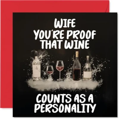 MAKE YOUR WIFE SMILE WITH THIS UNIQUE BIRTHDAY CARD: This exceptional quality Wife birthday card for her shows the design 'Wife Youre proof that wine counts as a personality'. If you are looking for a beautiful birthday card Wife for her, then then this happy birthday Wife card is bound to make her smile. Not just a birthday card for Wife this could also be a birthday gifts for Wife, Wifey or Partner. WHAT DO YOU GET: The card is printed on one side and BLANK ON THE INSIDE to allow you to write your very own message. The unique fun design is printed on a specially sourced and environmentally responsible board. At 360 microns thick the natural white one-sided gloss board has a quality look and feel. Supplied with a coloured gummed envelope to complement the design and ready to be sealed and sent in the post. Great Wife birthday cards, Wifey birthday card. NO INK SMUDGES: There is nothing worse than writing inside a card to find that the shiny surface makes the ink smudge. This is why we use a high quality one sided coated board. The uncoated side will absorb more of the ink from your pen to make smudging a thing of the past. Wife birthday cards, Wife birthday cards from Husband. SIZES: Greeting Card = 145mm x 145mm, Envelope = 155mm x 155mm, Card Thickness = 360 micron. Happy birthday Wife, Wifes birthday card, Wife cards birthday, birthday card Wife, happy birthday Wife card, Wife gifts from Husband. MADE AND QUALITY CHECKED IN THE UK: We print and manufacture all our products right here in the UK so you can be sure of a fast turnaround and a product that is expertly made. Using environmentally responsible premium board our card is conscious of the responsible management of the world's forests - happy birthday card Wife, Wife birthday cards.