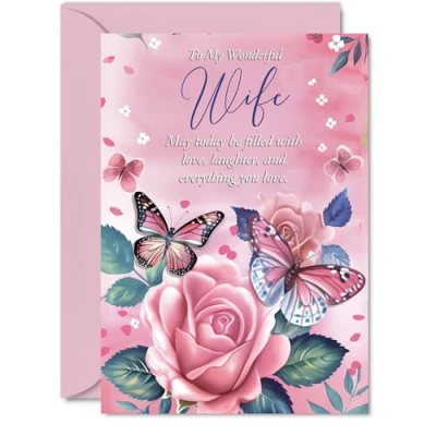Wife Birthday Card Pink Rose Butterfly Beautiful Happy for from Partner Husband, A5 Female Floral Bday Greeting Cards