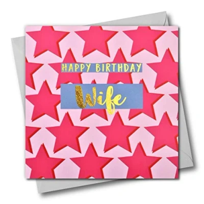 Wife Birthday Card, Pink Stars, Happy Greeting Card with Text Foiled in Shiny Gold