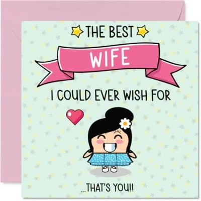 Amazon MAKE YOUR WIFE SMILE WITH THIS BEAUTIFUL BIRTHDAY CARD: This exceptional quality Wife birthday card for her shows the design 'The Best Wife I Could Ever Wish For? That?s You!!'. If you are looking for a beautiful birthday card Wife for her, then then this happy birthday Wife card is bound to make her smile. Not just a birthday card for Wife this could also be a birthday gifts for Wife, Wifey or Partner. WHAT DO YOU GET: The card is printed on one side and BLANK ON THE INSIDE to allow you to write your very own message. The unique design is printed on a specially sourced and environmentally responsible board. At 360 microns thick the natural white one-sided gloss board has a quality look and feel. Supplied with a coloured gummed envelope to complement the design and ready to be sealed and sent in the post. Great Wife birthday cards, Husband birthday card, Wifey birthday card. NO INK SMUDGES: There is nothing worse than writing inside a card to find that the shiny surface makes the ink smudge. This is why we use a high quality one sided coated board. The uncoated side will absorb more of the ink from your pen to make smudging a thing of the past. Wife birthday cards, Wife birthday cards from Husband. SIZES: Greeting Card = 145mm x 145mm, Envelope = 155mm x 155mm, Card Thickness = 360 micron. Happy birthday Wife, Wifes birthday card, Wife cards birthday, birthday card Wife, happy birthday Wife card, Wife gifts from Husband, happy first birthday as my Wife. MADE AND QUALITY CHECKED IN THE UK: We print and manufacture all our products right here in the UK so you can be sure of a fast turnaround and a product that is expertly made. Using environmentally responsible premium board our card is conscious of the responsible management of the world's forests - happy birthday card Wife, Wife birthday cards.
