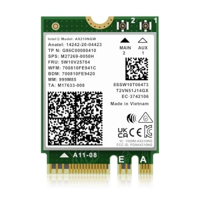 🌐Wi-Fi 6E: The network adapter that adopts the Intel Wi-Fi 6E standard. Intel WIFI 6e technology is powerful and compatible, equipped with an M.2/NGFF interface, while reducing power consumption and increasing service life. 🌐Tri-Band WIFI: AX210 brings wifi to 6GHz, upgrading wifi to tri-band. Utilizing the latest Wi-Fi 6 standard, tri-band (2.4GHz, 5GHz, 6GHz) models are available. Maximum speed up to 5374Mbps (2.4GHz@574Mbps; 5GHz@2400Mbps; 6GHz@2400Mbps). 🌐Bluetooth 5.3: Bluetooth version 5.3 is downward vertically compatible with lower versions. More stable connection, stable signal transmission without delay, can connect cell phones, computers, game consoles and other devices for wireless connection and transmission. 🌐Compatible Systems: Support Windows 11/10 64-bit, WiFi and Bluetooth drivers need to be installed on the running PC (search "AX210NGW" from Intel website to download and install wifi and Bluetooth drivers). 🌐Installation Requirements:For motherboards with Intel CPU and M2 network slot, NGFF M2 2230 A/E key.