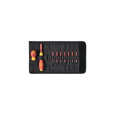 Tool set: All tools are securely arranged in a robust and clearly laid out tool bag with Velcro® fasteners, room for additional tools available in the tool pouch. Small Stubby handle + slimBits: included in the folding bag of the electric screwdriver, extra short ergonomic handle, suited for restricted spaces. SlimBits tested at 10,000 V AC and approved for 1,000 V AC. Screwdriver set for electricians: Suitable for all work in different environments such as construction sites, solar power systems, and switch cabinets. Extensive application range by changing the bits. Electrical screwdriver set: To ensure safety when working on live parts it is necessary that NO standard non-insulated ¼“ bits fit into the bit chuck. Contents: Electrical screwdriver set with 2x ergonomic Wiha SoftFinish handle, bits: slotted 2.5 - 5.5 | Phillips 1 - 2 | Pozidriv 1 - 2