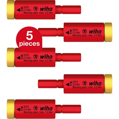 PROTECTION: The correct torque protects material from damage and means no follow-up work SAFETY: For the protection of the electrician/user, each tool of the torque set is individually tested at 10,000 V AC and approved for 1,000 V AC CONVENIENT: Extension to a torque tool for LiftUp electric and slimVario screwdriver sets EFFICIENT: The torque adapter set is compatible with the Wiha slimBit system, which features 33% slimmer blades for protected access to low-lying screws